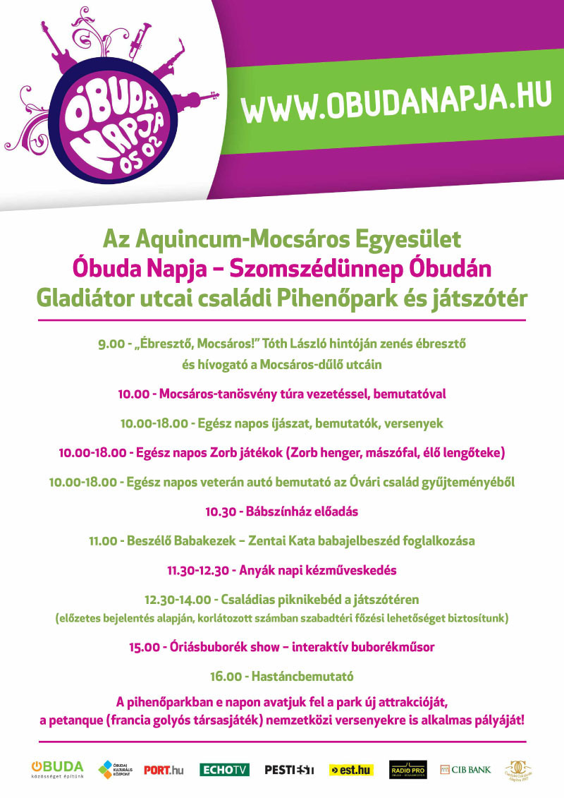 Önálló helyszínként veszünk részt Óbuda napja megünneplésében. „Szomszédolás” címmel minden itt lakó embert ismerkedésre és szórakozásra hívunk a Gladiátor utcába. A piknik jellegű összejövetelen érdekes és szórakoztató programot tervezünk megvalósítani, amiről az Óbuda Újság közöl tájékoztatót és a következő hírlevélben részletesen írunk majd mi is.